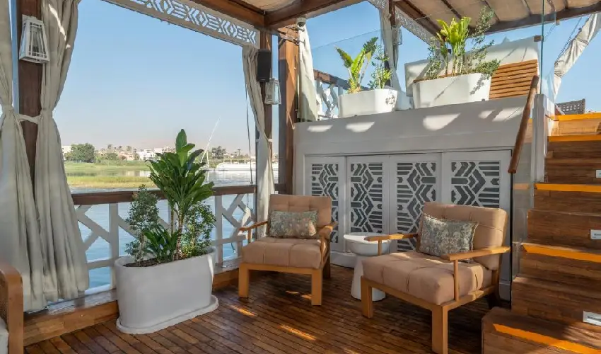 Imbarco prima di pranzo e partenza a bordo della tua Dahabeya sul Nilo Musk, per un viaggio esclusivo tra relax, eleganza e scoperta.