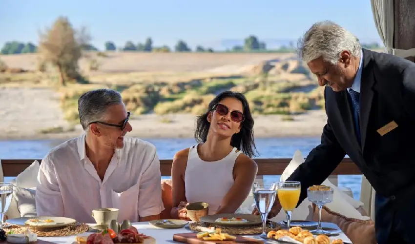 Rientro a bordo e pranzo durante la navigazione della tua Dahabeya sul Nilo Musk, uno dei momenti più rilassanti del viaggio.